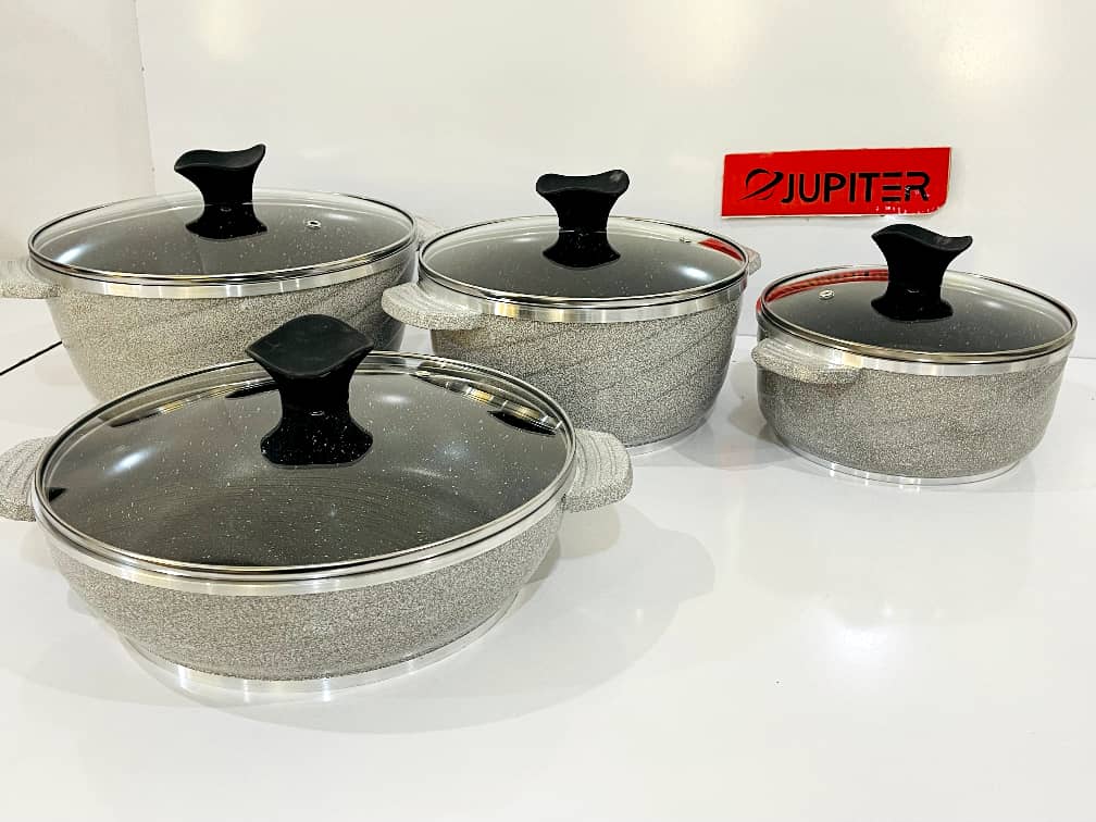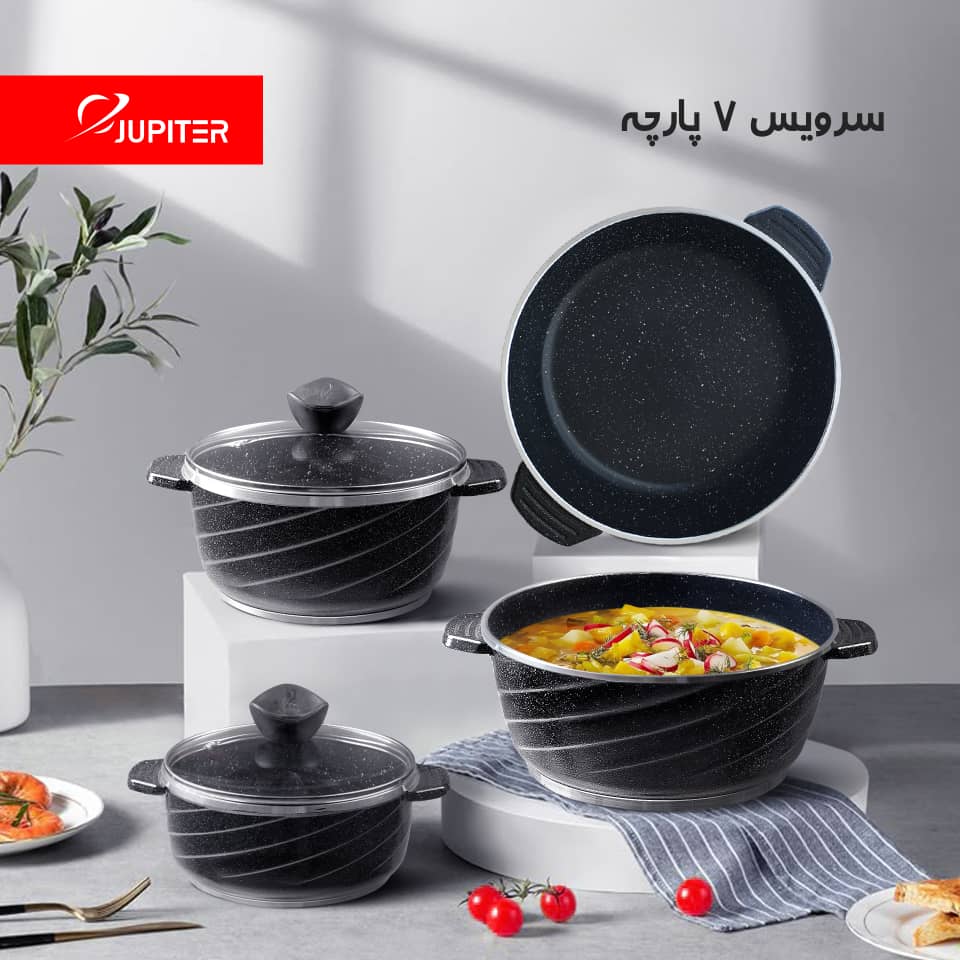 سرویس قابلمه ژوپیتر یکی از مدل های محبوب و با کیفیت بازار ایران است که با طراحی زیبا ، پوشش نچسب مقاوم و بدنه ی بادوام انتخاب خوبی برای استفاده روزمره در آشپزخانه محسوب می شود . این سرویس دارای روکش گرانیتی چند لایه ست که هم دوام بالایی دارد و هم باعث می شود غذا به کف ظرف نچسبد . درب های شیشه ای نشکن ، دسته های نسوز ، پخش یکنواخت حرارت و وزن استاندارد از ویژگی هایی هستند که ژوپیتر را به یک انتخاب مطمین برای خانواده ها تبدیل می کنند . این سرویس دارای سایز بندی کامل بوده و برای پخت انواع غذاها مثل برنج ، خورشت ، سرخ کردنی و... کاملا مناسب است . ظاهر مدرن ، کیفیت ساخت خوب و قیمت اقتصادی باعث شده ژوپیتر جزو سرویس های پرفروش بازار داخلی باشد . خانواده هایی که زیاد آشپزی می کنند و دنبال سرویس مقاوم و بادوام و همه کاره هستند این سرویس می تواند انتخاب ایده آلی برای آنان باشد . میتوانید این سرویس را با خیال آسوده از فروشگاه دیجی آکو خرید و استفاده نمایید .